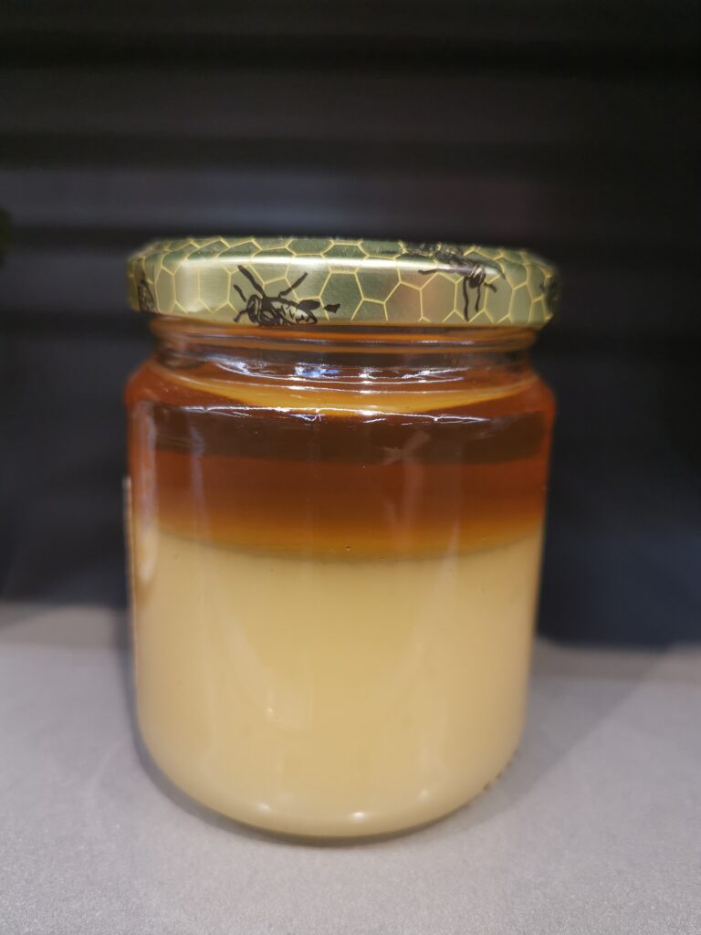 La partie inférieure du pot est cristallisée et la partie supérieur est liquide. A ne pas confondre avec un mélange de miel (printemps et forêt par exemple). Cela est la conséquence de la séparation du fructose et du glucose. Un miel trop humide, ayant subit une forte variation de température est susceptible de se déphaser.